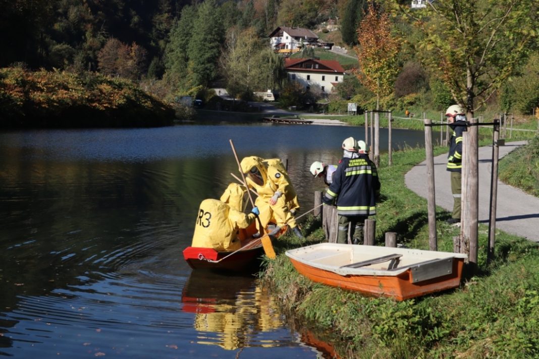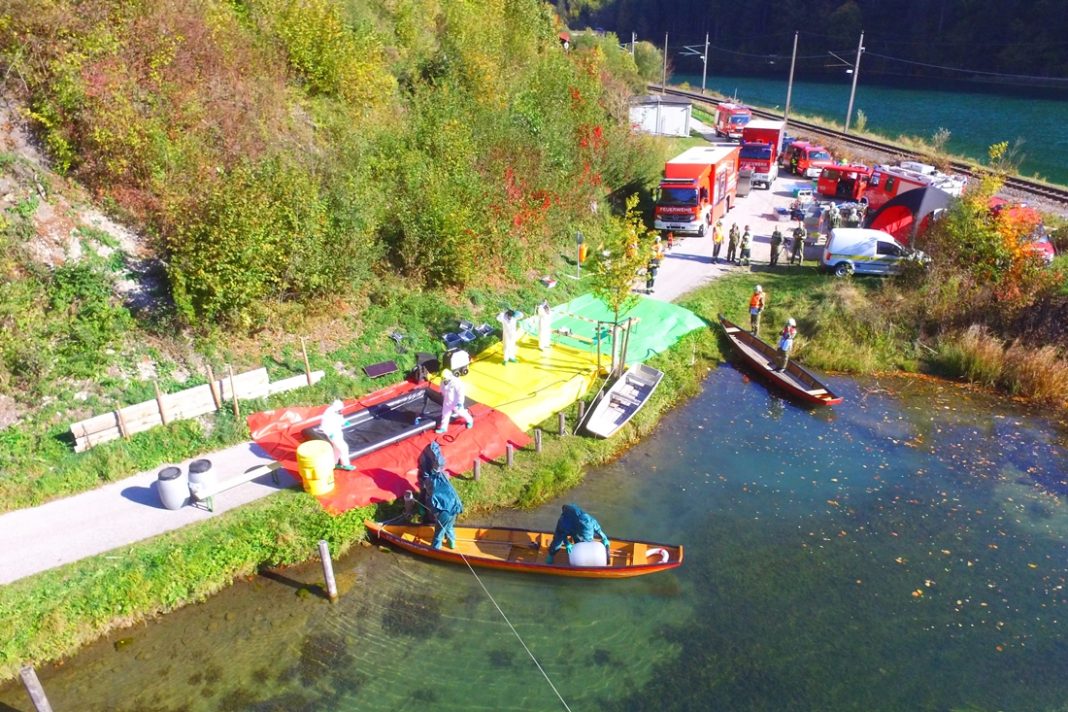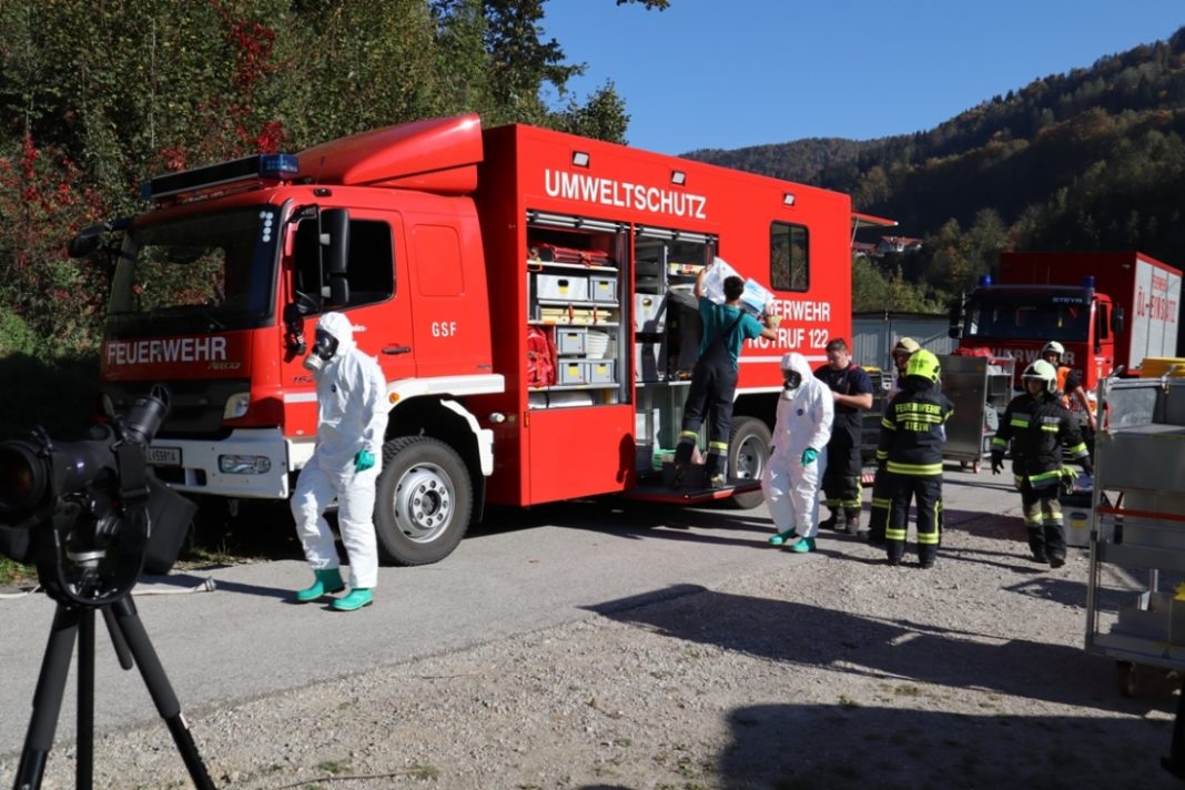 Die Einsatzstelle war jedoch nur über den Wasserweg erreichbar. Da anfangs nicht klar war welche Stoffe hier die Umwelt gefährden, wurde der Bereich weiträumig abgesperrt und eine Übungsleitung eingerichtet. Weiters wurde der „Gefährliche-Stoffe-Zug“ der Bezirke Steyr-Land, Steyr-Stadt und Kirchdorf angefordert.