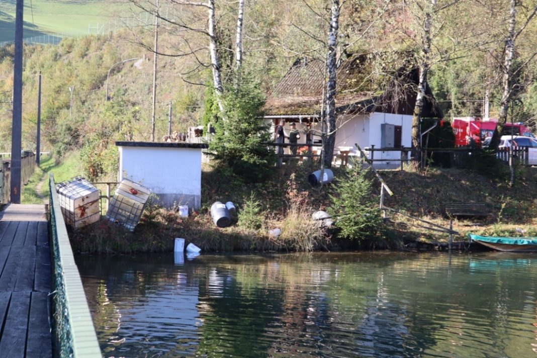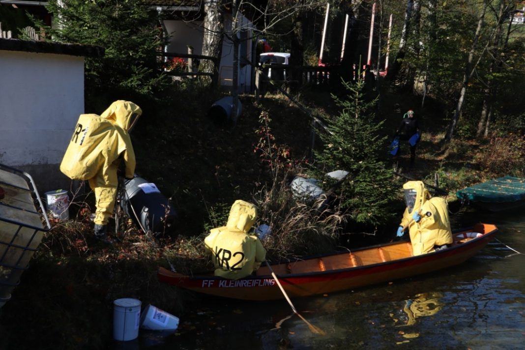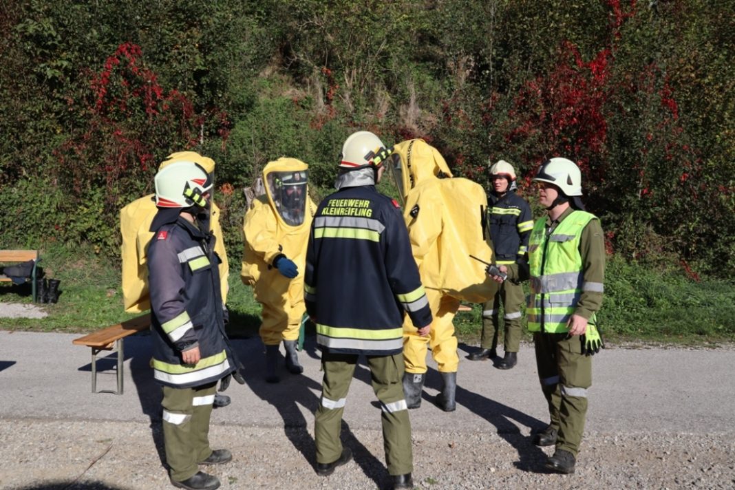 „Illegale Müllablagerung mit Gefahrgutbeteiligung“ hieß es in der Übungsannahme der Bezirke Steyr-Land, Steyr-Stadt und Kirchdorf letzten Samstag. Kurz vor halb zehn ging eine Alarmierung ein, woraufhin die Feuerwehr Kleinreifling umgehend zum Übungsort an der Seewiese ausrückte. Dort verschaffte sich die Mannschaft einen ersten Überblick über die Lage. Mehrere Fässer sowie zwei sogenannte IBC-Container wurden illegal im Bereich der Fischerhütte abgelagert.